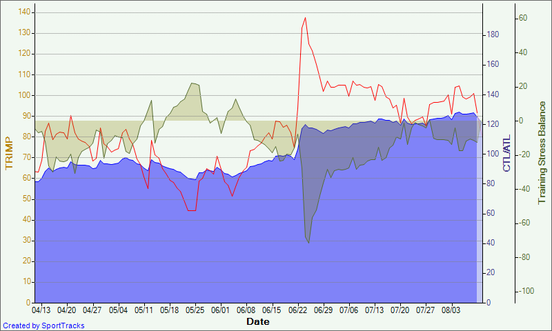 As you can from my weekly training volume graph above, each 2-3 week block of increasing volume is followed by a relatively decreased week. The only exception to this was the week of the IMLP Troy Jacobson Training Camp where I was up over 17 hours. This is also highlighted in the TRIMP(Training Impulse) graph below where the red ATL(fatigue measure) line spiked very high. Along with that spike also came a substantial increase in fitness or CTL which is indicated by the blue area. Through the prescribed periodization by my coach, the recovery weeks brought down that fatigue level while simultaneously continuing to build my fitness levels. The graph clearly demonstrates how those recovery provide more benefits than we realize.