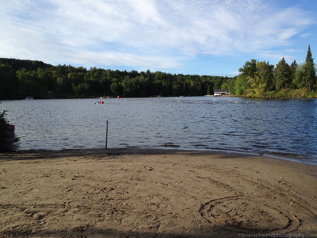 The 1.2 mile(2km) swim course formed somewhat of an flipped “P”. We headed in a clockwise direction flanking the beach, before turning towards the opposite shore and then back. The majority of the guys in my wave had congregated on the left, outer side which was closer to the shore. I assume because they were able to stand up. I had started to line up there myself, but my wife motioned out to the inner buoy towards the middle of the lake . I looked and there was hardly anyone there, which is quite odd. Usually this is where everyone congregates and you better know what you are doing to line up there. Today it was empty, so I headed over there and found a nice open space right behind the line. I could not stand here so I just laid back and floated until the gun went off.