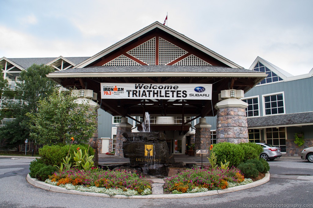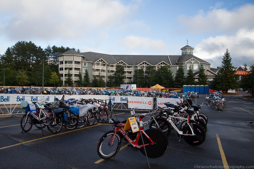 I think the best things about the Muskoka Ironman 70.3 race is the later 8AM start and the hotel proximity to the transition. The latter is only a benefit if you are actually staying at the Deerhurst Resort, which I did. Given those items I was able to sleep in until around 5AM race morning, enjoy a casual breakfast in the room, and make a short walk to setup my transition at 5:30AM. The morning was extremely stress-free. I also think that I am really starting to lose some of the anxiety that comes with a triathlon, but not all. It had rained pretty heavily on Saturday so the bags I used to cover my handlebars and seat had collected a bit of water in them. I created a bit of a stream through transition when I dumped them onto the ground. I did manage to keep from running through others stuff.