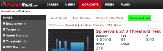 One of the cool features of TrainerRoad is the ability to integrate biking videos with some of the workouts. If you filter on “Video Workouts”, you can select a workout that is synchronized with a particular cycling video such as Spinervals or Sufferfest. The videos are sold separately through the appropriate sites and links are provided in the workout description. Pretty cool feature for passing away those hours in the basement.