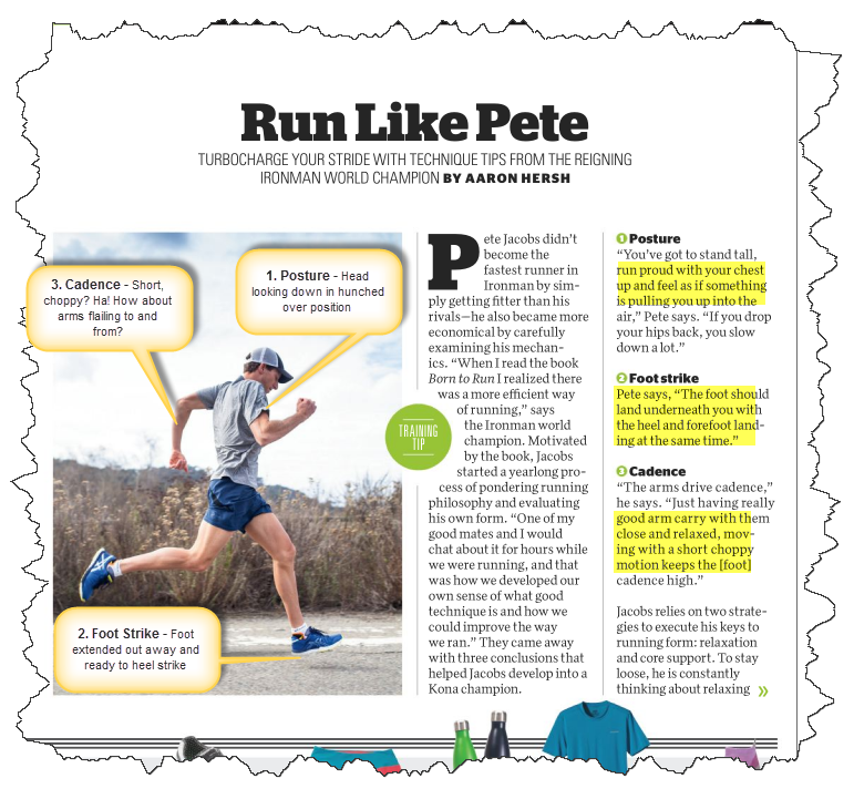 I was reading through my April 2013 Issue of Triathlete Magazine the other day and came across an article about running form named “Run Like Pete.” As a disciple and practitioner of the Chirunning method, I was pretty eager to read the article. The article was written by Aaron Hersh and it outlined 3 key forms that Ironman World Champion Pete Jacobs identified as the key techniques for proper running form. I totally agree all three of these techniques are the very important things to emphasize in your running practice. The problem I had with this article is that the picture they chose to use to demonstrate these 3 forms. The image shows Pete doing anything but what is defined in the article.