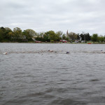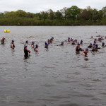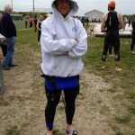 It was freaking cold and windy! The temp was around 43-45 deg F and the wind around 10MPH. I kept my sweatshirt on over my wetsuit and it was still chilly. Denise was anticipating me getting in the water so she could put my sweatshirt on over her DOWN jacket. We hung out waiting for my start for what seemed to be forever. I was a bit anxious to find out whether the water would be colder or warmer than what it was outside. As the previous waves started, the lifeguards were busy returning the many folks abandoning the race before the first turn buoy. Not sure if it was the cold or the muddy water at the start from everyone kicking it up. I did hear one girl say her wetsuit was too big for her and it was taking on too much water. She had never used it before…rookie mistake there.