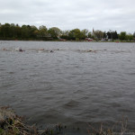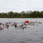 Finally my wave(purple caps for men >40) was called. We were after the yellow caps and the pink caps. I made my way to the narrow aluminum ramp that took us into the water. It was not too bad really. The bottom of the lake was that really soft murky mud that just seems to hover over the bottom. That usually freaks me out, but it was actually kind of warm so I let my cold feet wallow in it with pleasure. I got into my spot a couple rows back from front and slightly to the right and before I knew it the race director was yelling “Go!” from the shore line. Yes, nothing fancy here like a start gun or cannon. He didn’t even have a bullhorn. The start was pretty typical craziness with feet, legs and bodies hitting you from every direction. The water was so thick with mud you could not see anything. It was total darkness in the water. Didn’t really bother me too much, but I could see how a newer triathlete could lose it. My face had started feeling a bit numb from either the coldness of the water or the cold air when breathing, not sure which. I did get used to it. The madness continued to the first turn and then slowly mellowed out until the second lap.