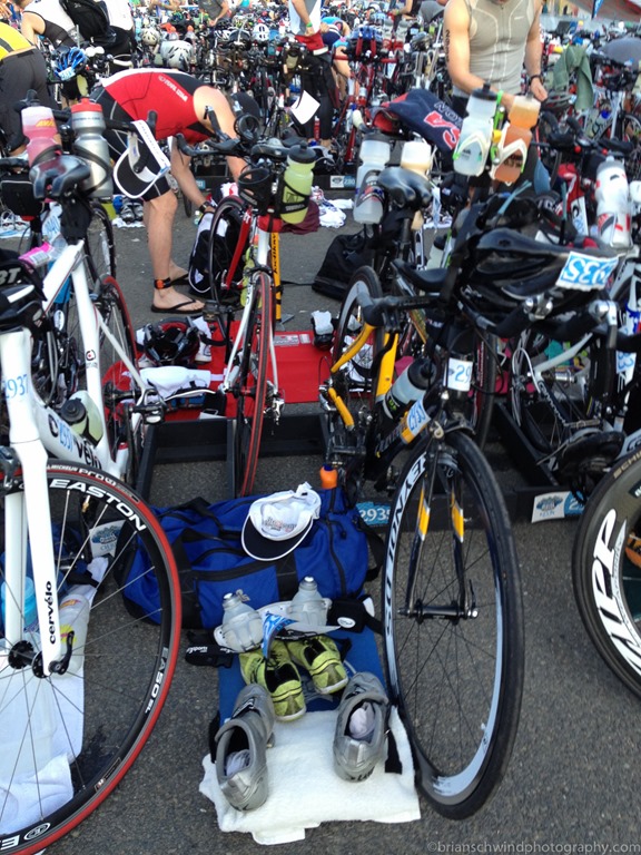 Transition is probably one of the best I have seen. Each spot is marked with your name and bib # on the wooden framed “racks” on the ground. The frame has a narrow section to stick your rear tire of your bike and a wider section for your bag. Your race gear is then laid out in front of the wood box. It is very clear what real estate is yours and there is adequate room. I was 3 rows from the swim and entrance and run exit which was nice. Bike in/out was a bit of haul, but still not too bad.
