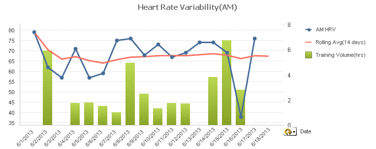 Sunday morning I woke up a bit groggy. I reached over to my nightstand, fumbling around until I felt the elastic band of my heart rate monitor strap. I squirmed around wrapping the HRM around me without actually sitting up in bed, a task I have become quite proficient at over the last several months. I check my Heart Rate Variability(HRV) every morning. I was curious what HRV reading would be this morning after the 100+ mile bike ride and brick run yesterday. I hit the start button on the Sweetbeat HRV iPhone app and tried to relax as best I could for the next 3 minutes. After the buzzer went off, indicating the test had completed, I was more than shocked to see a reading of 36. Half of the previous days’ reading of 69. Obviously Saturday’s training had taken its toll on me and my body was a bit of stressed. Despite the app telling me to take it easy today, I had a 2:45 long run to do today, so the easy day will have to wait until tomorrow.