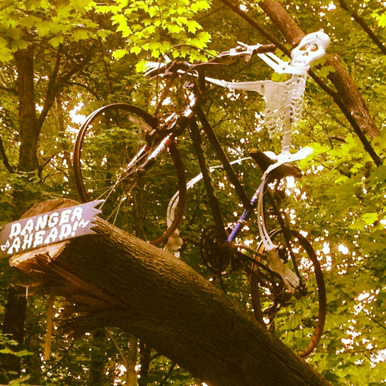 I approached the homemade sign and skeleton on bike pictured below with about 5 miles left to go. Little did I realize that this was a real warning. With about 3 miles left to go I started to cramp up a bit. I started picking out landmarks to run to to keep myself going. I took a couple opportunities to stretch and walk a bit. It was pretty brutal. I had run out of my standard Skratch Labs hydration mix and was using some Nuun tablets instead. Nuun tablets are very gasey and they contain Sorbitol, which I am not keen on. I was burping away the whole time and my water bottles looked like they were ready to explode. I don’t think I will be using that again.2013-06-23 12.45.23-1