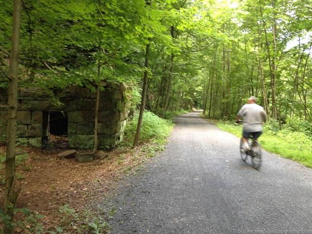 I stopped at the car after the trip to Northampton and back to refuel and scarf down an Amrita bar, then I was back heading north towards Slatington. The Cove Road parking lot was now starting to fill up with people tubing the river and biking. The D&L trail from Cove Road to Slatington is very shady and I could not have asked for a better section trail at this time of day. Regardless, it was still crazy hot. I was sweating profusely and my shorts were dripping wet. Despite the heat I was still feeling ok. My legs were a little stiff from the 90+ mile ride the day before, but tolerable.