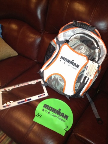 Next up was weigh in. I am not sure exactly why they weigh you before the event, but I think it may be in case you dehydrate or something so they have something to compare to. I was able to ditch my shoes but I had a bunch of stuff in my pockets…had to be at least 5 lbs! Really!! Anyway the scale read 178! Wow…fat boy! I was 174 when I left home the day before. Hmmm. After that I was directed to a few more stations were I was given my swim cap, race number stickers, gear bags, and some swag consisting of a IMLP license plate holder and event poster. Finally, a race chip was programmed with my race number which I would wear on my ankle for the entire race so that my times are recorded along the course. On the way out another volunteer directed me down to the Ironman Store at the race expo in the speed skating oval to pick up my swag backpack.