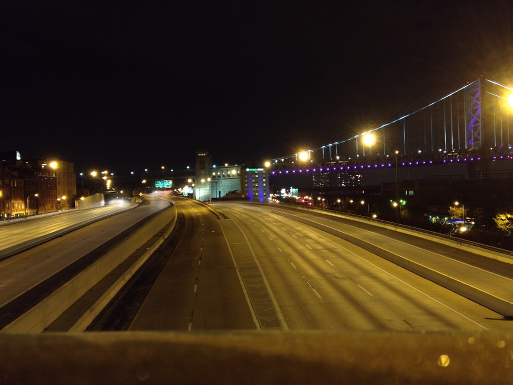 Night shot of i-95 and Ben Franklin Bridge from Market St. Bridge.
