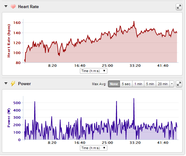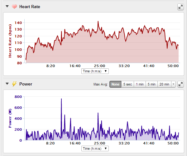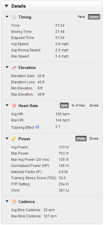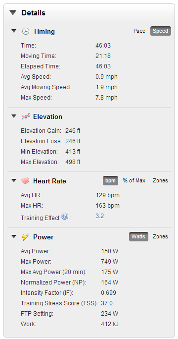 My heart rate was surprisingly lower this time. Must be due to having a little less caffeine coursing through my veins today. Since the PowerCal calculates power based on a heart rate algorithm, my power was also a bit less. Intensity Factor(IF) was fairly close though. I also burned about 400 calories here too.