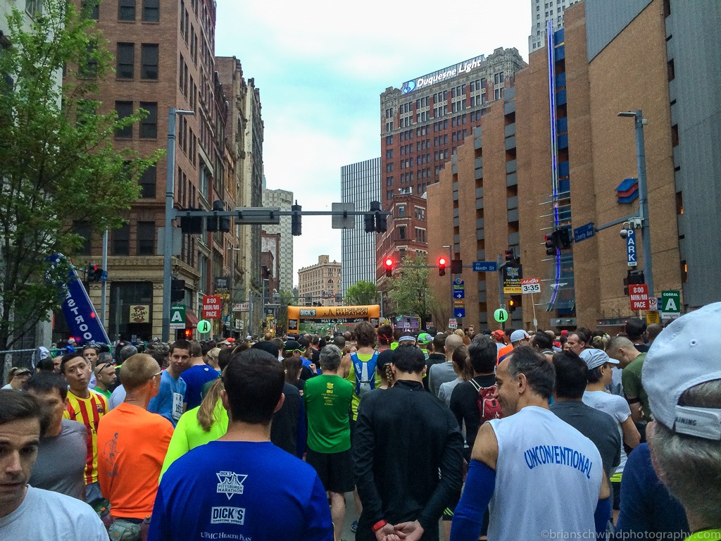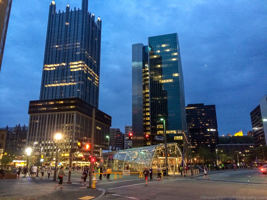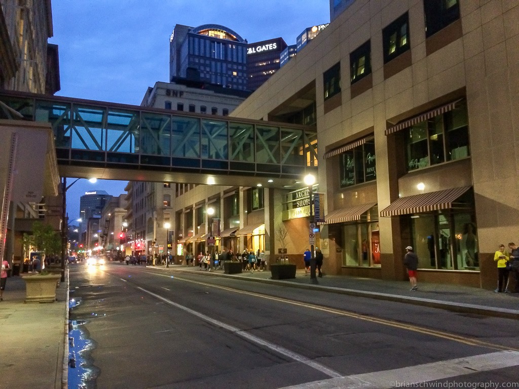 We hopped in the CR-V and headed down I-279 to the parking lot by Heinz Field. On Saturday, the parking attendant said she was not going to be there until 5:30am, so we could park for free if we beat her. Fat chance! There was another attendant there before and we waited in the short line to pay our $5 to get in. A T-line rail train had come and left while we parked, so we would have to wait for the next. We got up the platform, which was pretty empty and waited. More and more runners accumulated while we waited and eventually the train came and quickly shuttled us downtown.