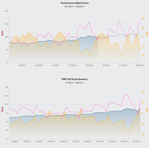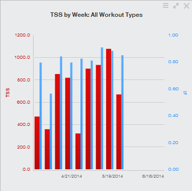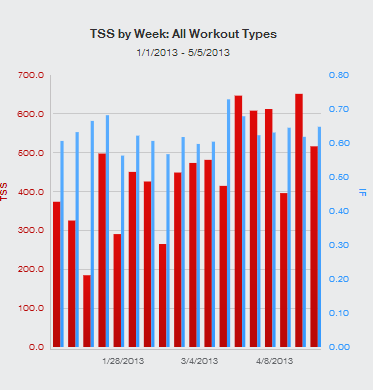 Looking back at last year, I am a couple hours ahead in volume and TSS this year. That is kind of the plan. I am hoping to top out around 17-18 hours here and then start increasing the intensity a little bit. I am also planning on moving to 2 week builds and 1 week recovery from here on out. This tends to benefit me more with the added intensity and it also works into my schedule better too.