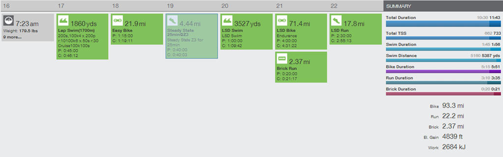 My love-hate relationship with recovery weeks continues. I always look so forward to them, but then feel like crap most of the week. It is nice to have some extra time to do things I have been putting off though. I finished the week with almost 12 hours of training. While that probably still seems like a lot to most people, it is 5-6 hours less than my prior weeks. Most of the rest time occurred during the beginning of the week and I kept the long workouts long on the weekend. I did cut my long bike on Saturday back to 4:30hrs, but still got in a decent 72 miles.