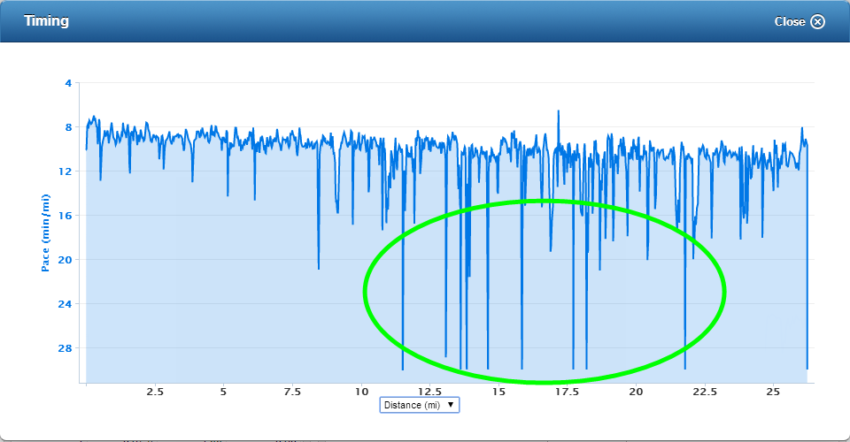 As you can see from the chart below, my 2nd loop had much more walking in it. The turn to head back out of town again for another 13 miles really played on my mental focus and lead me to walk a bit more here. You can see that most of it was also in the first 6 miles too, which is mostly downhill. I actually picked it up a bit heading back to town. I have been working on the mental side of things this year and I hope that I can resolve that 2nd loop mental breakdown a bit and keep it steady. A 4 hour marathon is attainable for me, I just need to keep my head on straight.