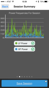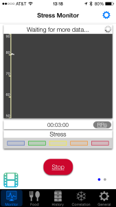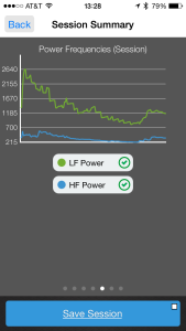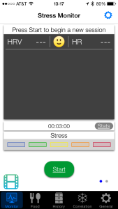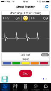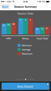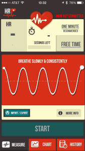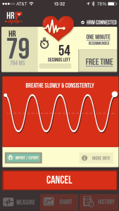 When you first go into the app it takes you directly to the monitoring screen. It does pop up an annoying dialog to tell you that your “Bluetooth Smart Sensor connected” which I feel is a bit annoying and unncessary. Once you tap ok then you have to wait 10-15 seconds for a little green start button to enable. Then you can take your 1 minute reading. There is a little breath rhythm coach that guides your breathing if you are staring at the screen. There is a little countdown timer to let you know how much time is left which is very readable compared to the other apps.
