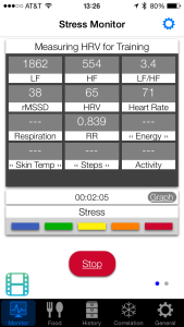 Sweetbeat recommends that you create a baseline HRV reading the first time you use the app. To take an HRV measurement, you tap the start button on the main screen , which then presents you with a dialog of 3 types of HRV tests: Monitor Stress, HR Recovery and HRV for Training. For me the last one is all I am interested in. You are quickly presented with another dialog stating that your “Bluetooth Smart Chest Strap is not Detected” which you have to hit ok. You are then presented with another “Bluetooth Smart Chest Strap is not Detected” dialog warning before you can do anything. The first time I got this had been after using another HRV app which I had used my BT HRM strap so I knew it was connected. I eventually realized this is a bug which requires you to start the twice just to get to start measuring your HRV. I thought they would have fixed this by now, but it has been there for some time now.