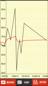 Once you get passed the plethora of screen prompts and messages it finally starts measuring your HRV. By now, my HRV has probably dropped numerous points due to the stress of all the screens I had to go through to get started. The test sampling time is 3 minutes after it receives a certain amount of readings. Based on what I have seen over that time it is a bit of overkill since the readings pretty much flatten out after a minute or so. Most of the other apps are only a minute. Once the test is complete you are presented with a graph of your readings over time and your reading today, previous and last week. Once you accumulate a bunch of readings this trend graph is pretty much useless and there is now way to filter out the amount here. In order to get your resting heart rate(RHR) for the session, you have to flip through multiple screens to obtain that value from a very odd graph page. I don’t understand why they could not put all of these values on one dashboard style screen and be done with it. Instead you have to scroll sideways through seven different screens, many of which have a large amount of wasted “real estate” on them. Stephen Few and any UX expert would have a field day with this app. So I would have to say that this was the most cumbersome of all the apps regarding speed of measurement. Fail