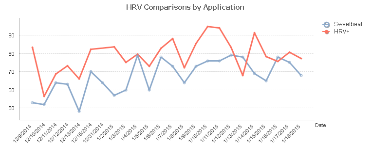 On average, the HRV+ app ran about 11.4 points above the Sweetbeat readings.
