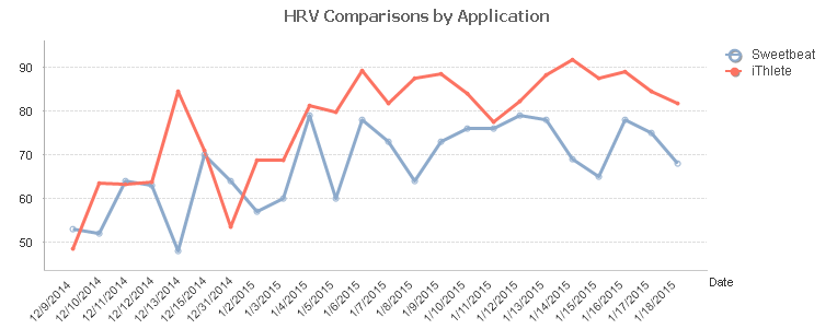 The HRV values for this app seem to be a little more on par with the Sweetbeat values from what I can tell. The graphs above seem to indicate this although Ithlete does seem to show higher values as overall HRV increases. On average, iThlete runs about 7.8 points above the Sweetbeat app.